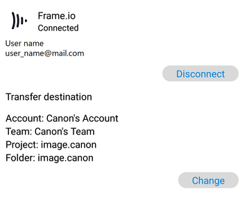 Open the Frame.io settings screen and select "Change" as the transfer destination.