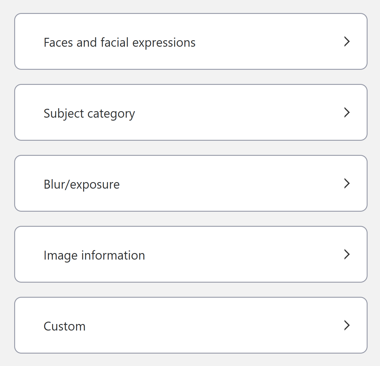 People / Living things / Animals / Dogs / Cats / Birds / Plants / Vehicles / Cars / Trains / Airplanes / Foods / Sports / Buildings / Mountains / Water / Night views You can sort by specifying multiple categories from the 17 categories above. You can specify multiple categories. In that case, photos will be sorted as long as they contain at least one of the following categories. |